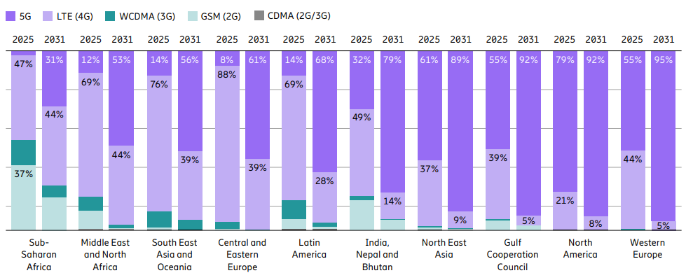 Para 2031,Ericsson proyecta que las conexiones móviles 5G ascenderán a 553 millones,por lo que representarán 68% de las suscripciones totales.